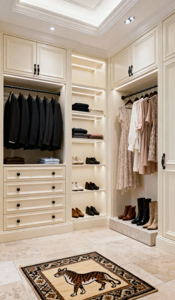 Finally, a beautiful example of a classic, tailored closet that balances style for both him and her! The creamy white cabinetry and black hardware give it a clean, sophisticated look. I love the built-in shelving with the accent lighting—it’s perfect for showcasing shoes and folded items. The way the dresses and suits are neatly stored shows how well-designed and practical this space is. And that fun tiger rug adds a unique, playful touch to the otherwise sleek design!
