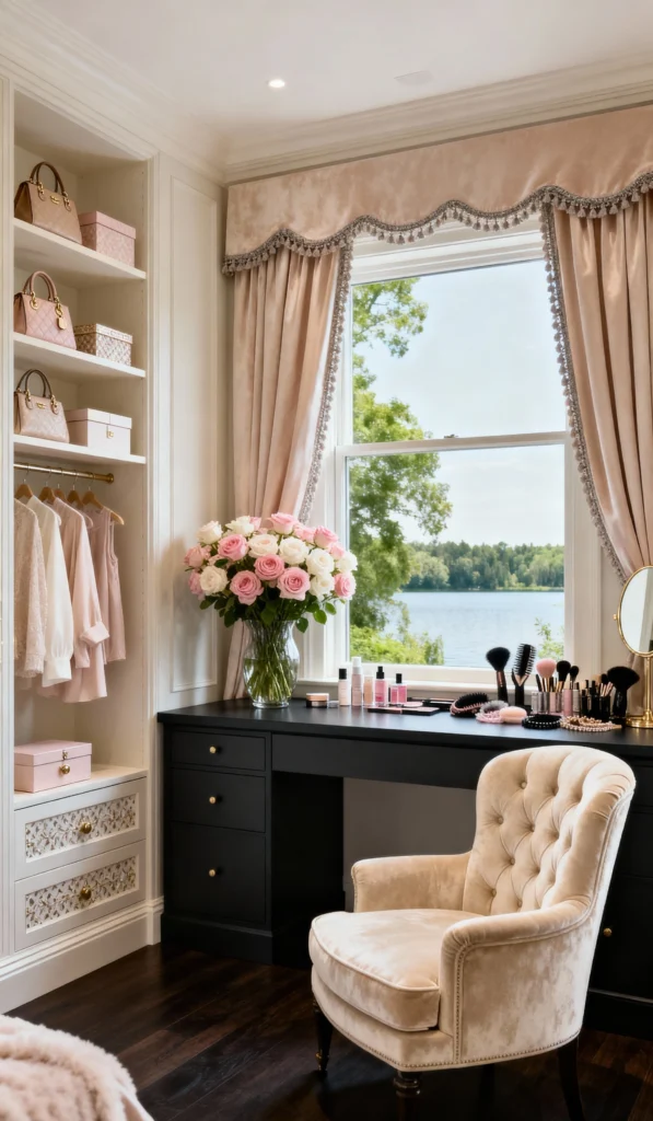 Okay, this spot is every beauty lover’s dream! Imagine sitting here, sipping coffee, and getting ready with that incredible view. The soft pink curtains and blush accessories paired with the crisp white shelving give it a lovely, feminine touch, but the sleek black vanity grounds the space with a modern edge. And those roses? Swoon. It’s the perfect blend of a functional walk-in closet and a serene, sunlit dressing table. I’m obsessed with how they’ve turned a window nook into a fabulous focal point!