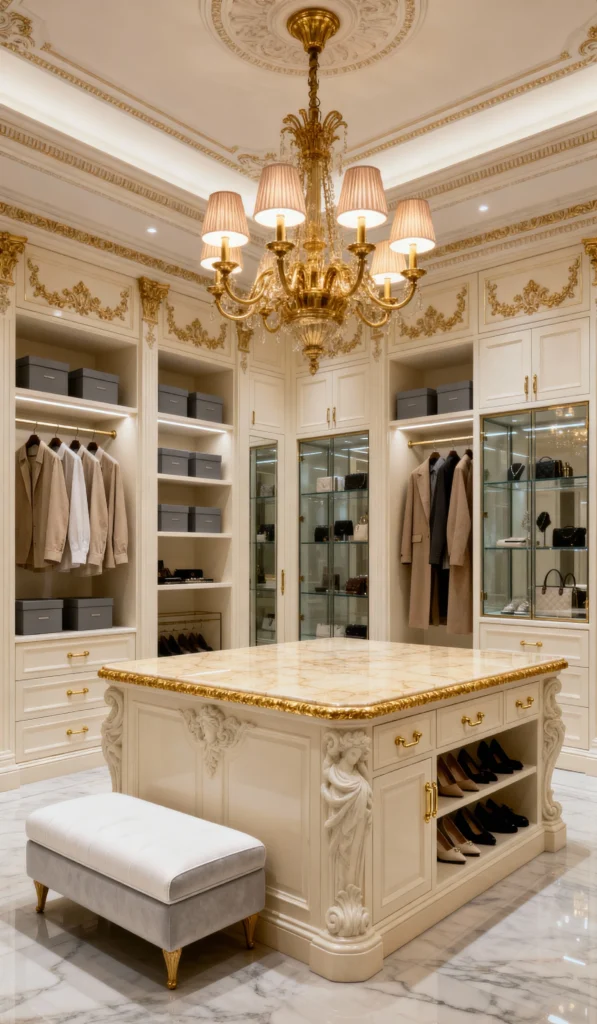 If your style is “grand, luxurious, and straight out of a European palace,” then this is your closet! The detailed carvings on the cabinetry and the amazing, over-the-top gold accents truly make this a work of art. The massive central island with its intricate base and gorgeous gold-veined marble top is the undisputed centerpiece. It’s a bold statement that says, “I appreciate the finer things,” and the chandelier is the perfect finishing touch. It’s classic, it’s elegant, and it’s absolutely fabulous.