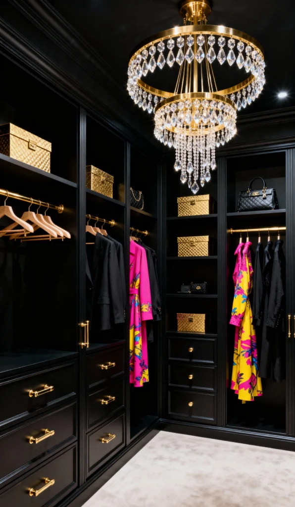 This all-black closet is the epitome of high-fashion cool. The dark cabinets create a sophisticated backdrop, allowing the clothes and those striking gold accents to truly pop. Notice those matching gold storage boxes? Such a smart way to add cohesive color and texture! And of course, the stunning tiered crystal chandelier brings that necessary glam factor. This closet proves that dark colors can be just as exciting and luxurious as light ones—it’s pure, undeniable style.