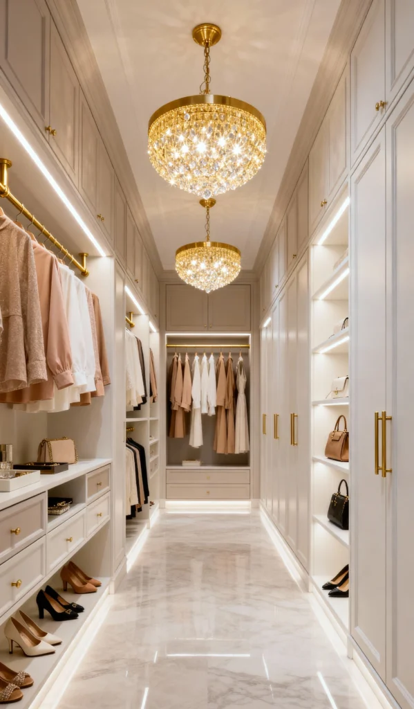This immaculate closet is giving pure resort-wear luxury. The pale cabinetry and bright lighting make it feel expansive and effortlessly elegant. The long runway of marble flooring with soft gold veining is just spectacular—it makes the space feel extra open and bright. Plus, having the clothes so perfectly displayed, from the hanging racks to the illuminated shelves, makes everything feel like a precious boutique collection. Those crystal chandeliers are the perfect finishing sparkle!