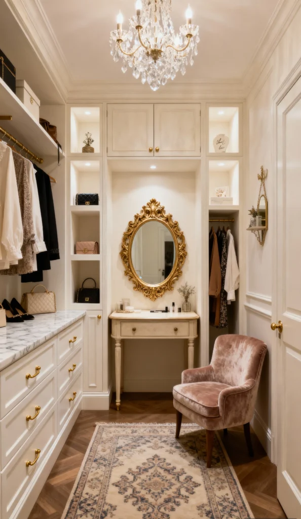 This closet feels like it belongs in a five-star penthouse! The pairing of crisp white cabinets with glossy, gold-veined marble floors is pure genius. The floor reflects the light beautifully, making the space feel endless. I especially love the mirror-paneled doors; they not only look incredible but also make the walk-in feel twice as big. The little blush velvet ottoman with the silver and gold trim is the perfect place to sit and try on shoes. It’s light, bright, and utterly luxurious.