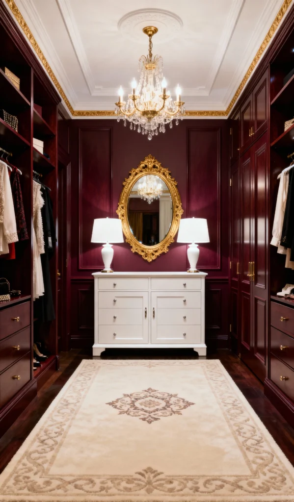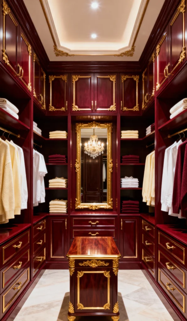 Can we just take a moment for this breathtakingly regal closet? The rich, deep maroon (or ruby) cabinetry combined with the opulent gold trim is giving me serious royalty vibes. Seriously, walking in here must feel like stepping onto a movie set! The bright white central dresser, the sparkling chandelier, and that gorgeous gold-framed mirror create a perfectly balanced and incredibly sophisticated look. It feels warm, luxurious, and perfectly sets the stage for getting dressed. It’s proof that a bold color can totally elevate a small space!