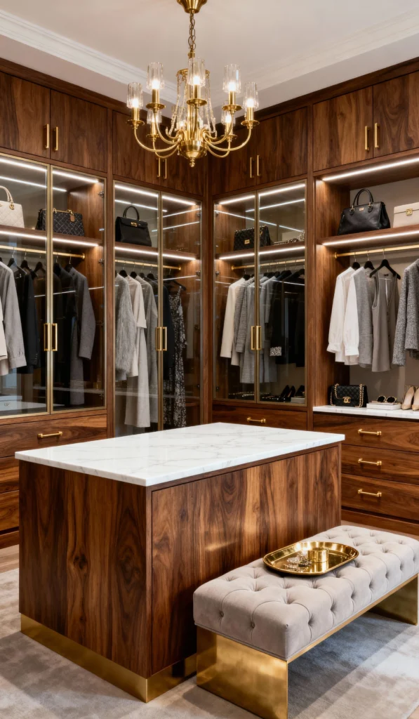 This is how you do a modern closet with serious oomph! The rich, walnut wood and sleek brass accents are a match made in heaven. I love how the gold-framed glass cabinets showcase those gorgeous bags and keep everything feeling organized but visible. And that central island? Pure genius! The clean white marble top and plush velvet bench with a brass base make it the perfect spot to lay out outfits or just take a moment to admire your collection. It’s warm, inviting, and incredibly chic.