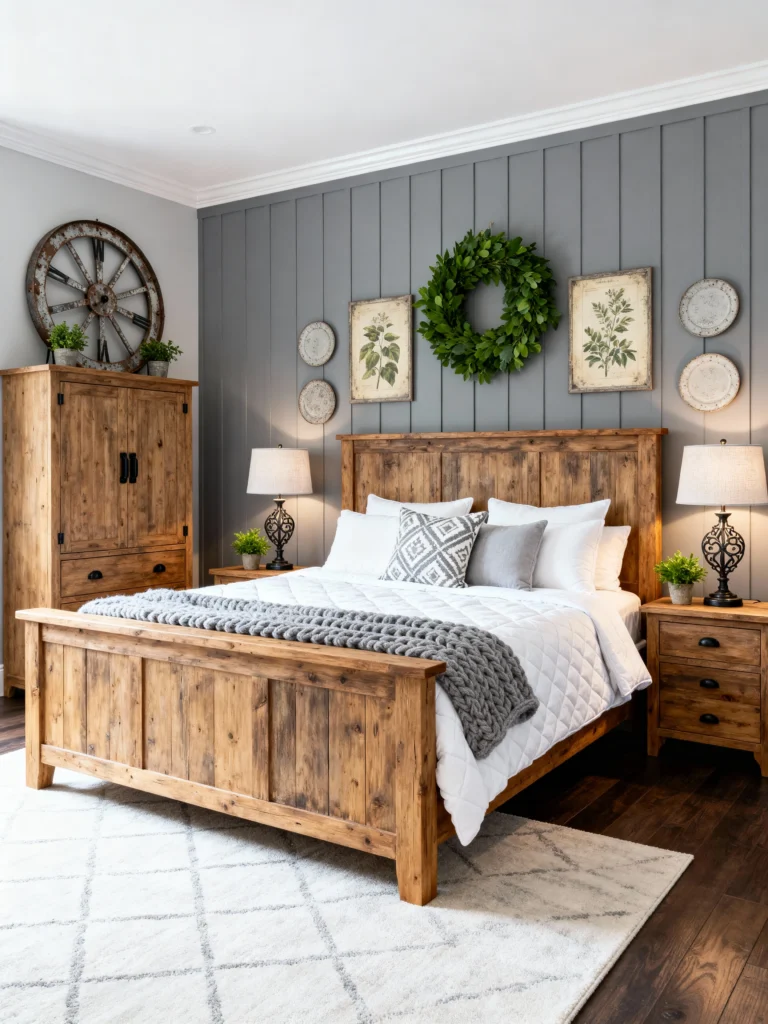 This room is the perfect example of how to do “modern rustic” right. The vertical wood paneling in that soft slate grey gives the room so much height and texture without feeling heavy. I love how the sturdy, honey-toned wooden bed frame anchors the space. It feels incredibly solid and timeless.