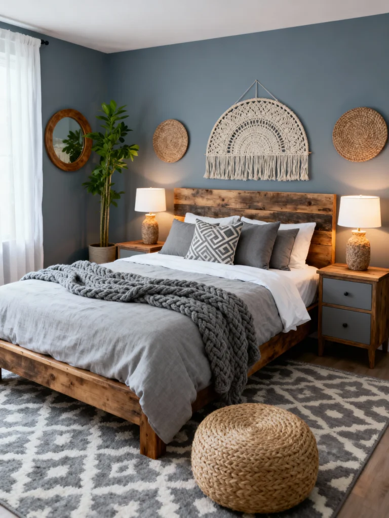 If your goal is to wake up feeling like you’re at a boutique spa, this is your blueprint. The dusty blue walls are incredibly calming—it’s like looking at the ocean on a cloudy day. The macramé wall hanging above the bed is a total showstopper; it adds that bohemian “artisan” touch without needing a million colors.