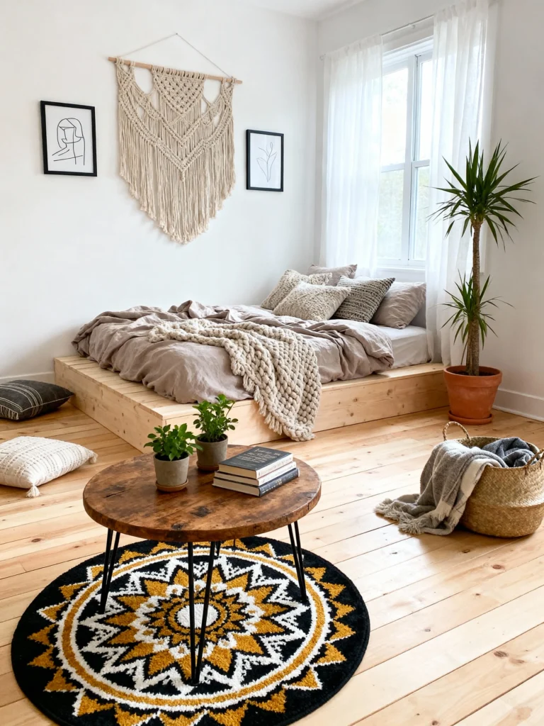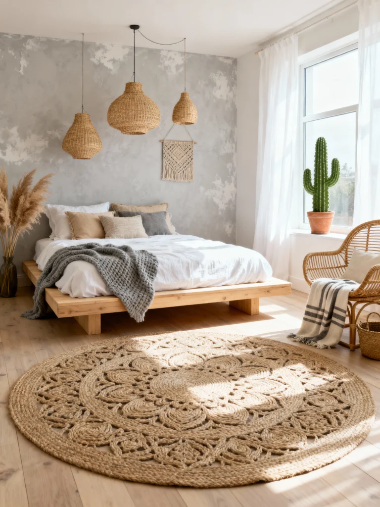 The oversized, circular jute rug is the real hero here. It mirrors the shape of the sun and grounds the floating platform bed. And honestly, who doesn’t need a giant cactus by the window? It adds that perfect “desert chic” vibe. If you have a room with great natural light, keep your bedding white and let the natural textures do all the talking.