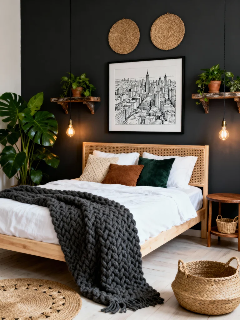 I love the contrast of the cane headboard against the dark paint—it’s very “tropical vintage.” The hanging Edison bulbs are a great touch too; they provide a warm, amber glow that keeps the dark walls from feeling cold. Throw on a super-chunky dark grey knit blanket, and you’ve got a space that feels sophisticated yet incredibly cozy.