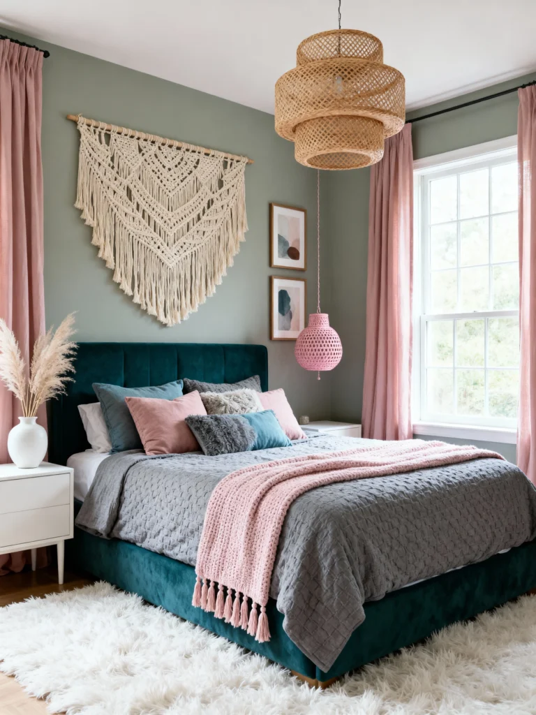 The sage green walls are a much softer alternative to grey or white, and they make the pink curtains feel very intentional rather than sugary. The tiered wicker chandelier adds that essential boho texture, while the macramé wall hanging keeps the vibe relaxed and crafty.