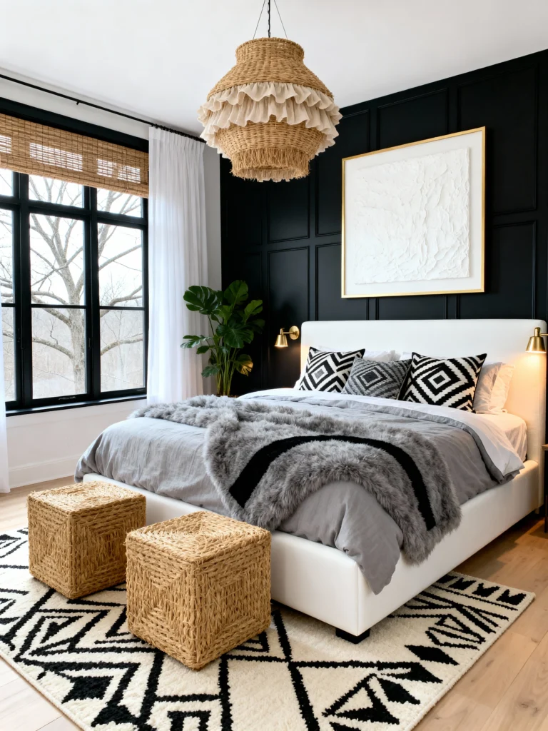 Texture is what saves this room from feeling flat—the fuzzy grey faux-fur throw and the woven “cube” ottomans add layers you just want to touch. The geometric rug pulls the whole theme together. It’s proof that you can be a minimalist and a bohemian at the exact same time.