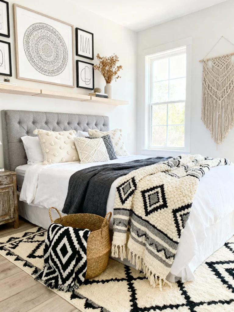 The pairing of the reclaimed wood headboard with those stone-textured bedside lamps creates a beautiful balance between “rough” and “refined.” Also, that grey and white geometric rug? It’s a genius way to add pattern without overwhelming the eyes. Don’t forget a tall potted plant in the corner to breathe some life into those cool tones!
