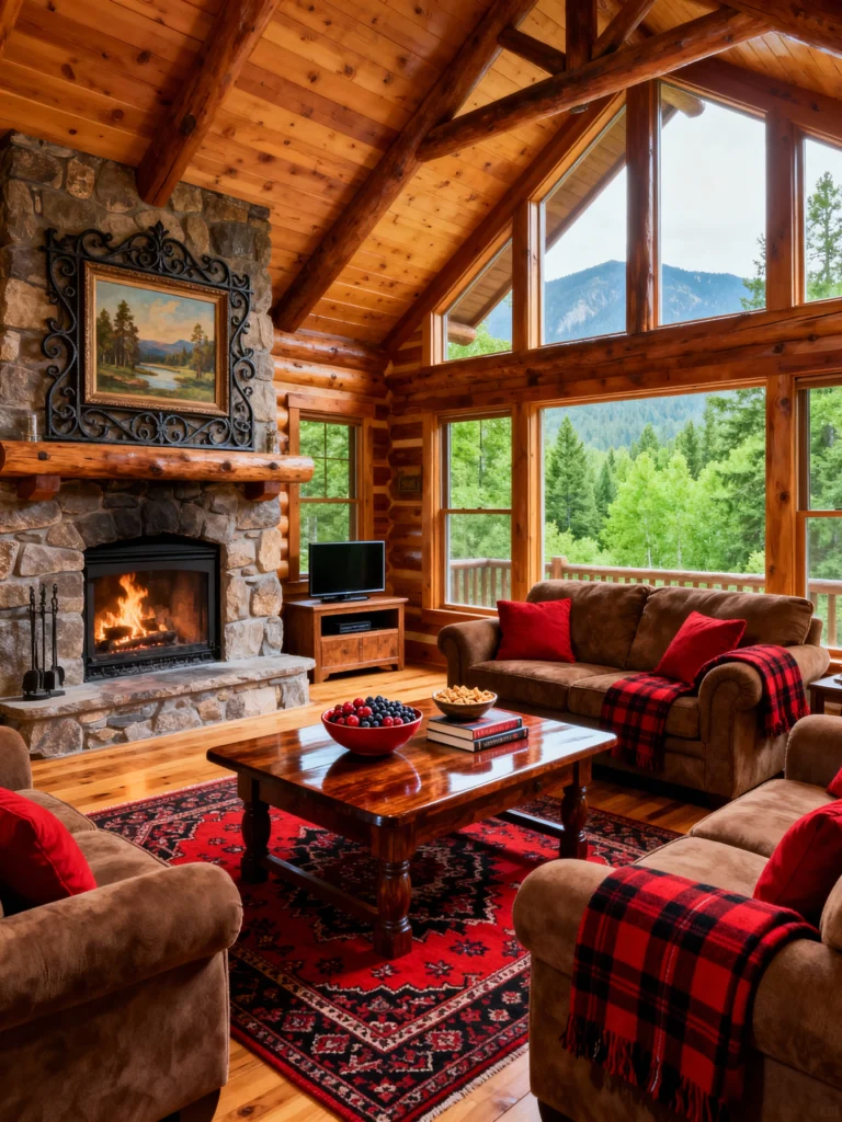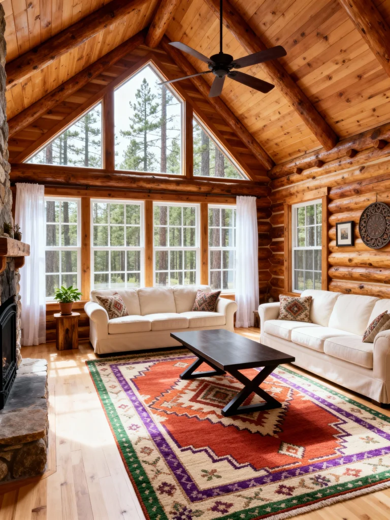 This is the ultimate cozy cabin! The towering, A-frame ceiling lined with natural wood logs makes the space feel incredibly grand and inviting at the same time. The huge wall of windows follows the roofline, letting in tons of natural light and giving you a picturesque view of the pines outside. While the bones of the room are rustic, the crisp white sofas and sheer curtains keep things feeling fresh. The real star of the show, though, is that bold, geometric area rug in fiery reds and purples—it injects so much personality and warmth into the wood-heavy setting. It’s the perfect blend of rustic and refined.