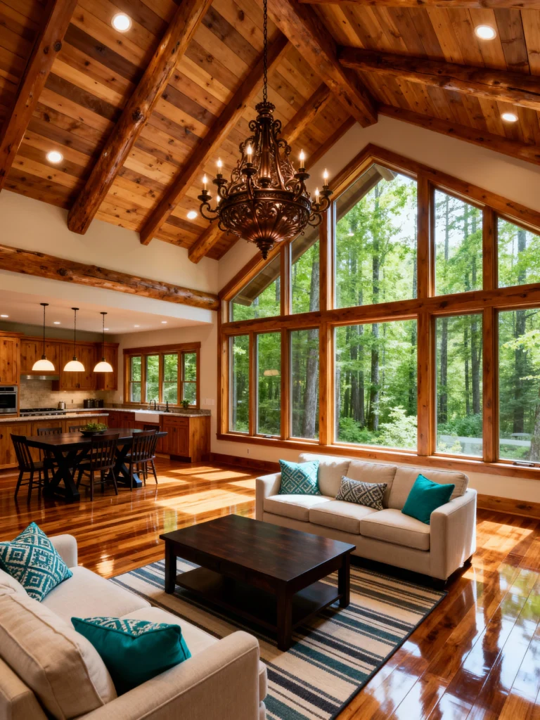 This open-concept living room feels absolutely majestic thanks to that breathtaking two-story window wall! The expansive view of the dense green forest is like living inside a nature painting. I adore the mix of textures here—the smooth, glossy wood floors reflecting the light, the exposed log beams on the ceiling, and the simple, modern sofas. The pop of color comes from those vibrant teal and white accent pillows, which perfectly echo the lush greenery outside. The rustic chandelier adds a touch of classic lodge elegance. It looks like the ideal spot for a weekend getaway where you can truly disconnect and recharge.