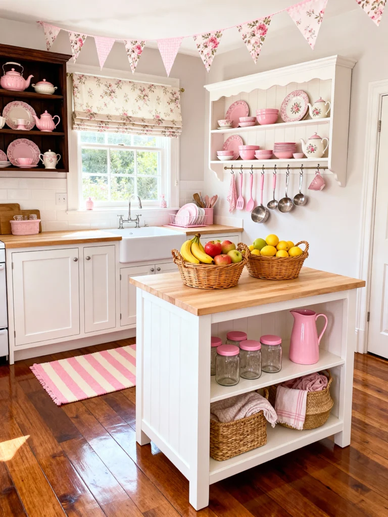 Oh my goodness, this kitchen is a fairytale brought to life! The combination of crisp white cabinets and the soft blush pink accessories is absolutely breathtaking. Notice how the open shelving beautifully displays a collection of pink china—talk about a stunning focal point! The floral bunting strung across the top adds a playful, celebratory touch, and the striped pink rug on the dark wood floor grounds the whole look. I also adore the cute little butcher block island, serving as the perfect spot for those overflowing baskets of fresh fruit. It truly looks like a place where every cup of tea is served with a side of joy. This space proves that you can embrace femininity and vintage charm without sacrificing bright, clean style.