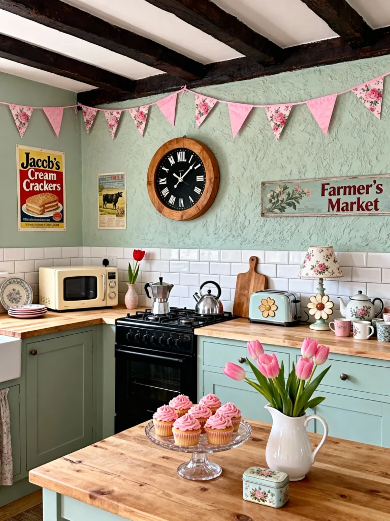This kitchen perfectly marries rustic architecture with a sweet cottage aesthetic. The dark, exposed wooden ceiling beams provide a wonderful contrast to the soft sage-green walls and cabinets, giving it that classic, English country feel. The pops of pink—from the floral bunting to the vase of tulips and the irresistible cupcakes—add such a playful and feminine touch. The vintage-style advertisements and the cute “Farmer’s Market” sign enhance the nostalgic atmosphere. It’s a wonderfully balanced space that feels both stylish and incredibly lived-in. I can just imagine having a relaxed morning coffee here, surrounded by all this charm.
