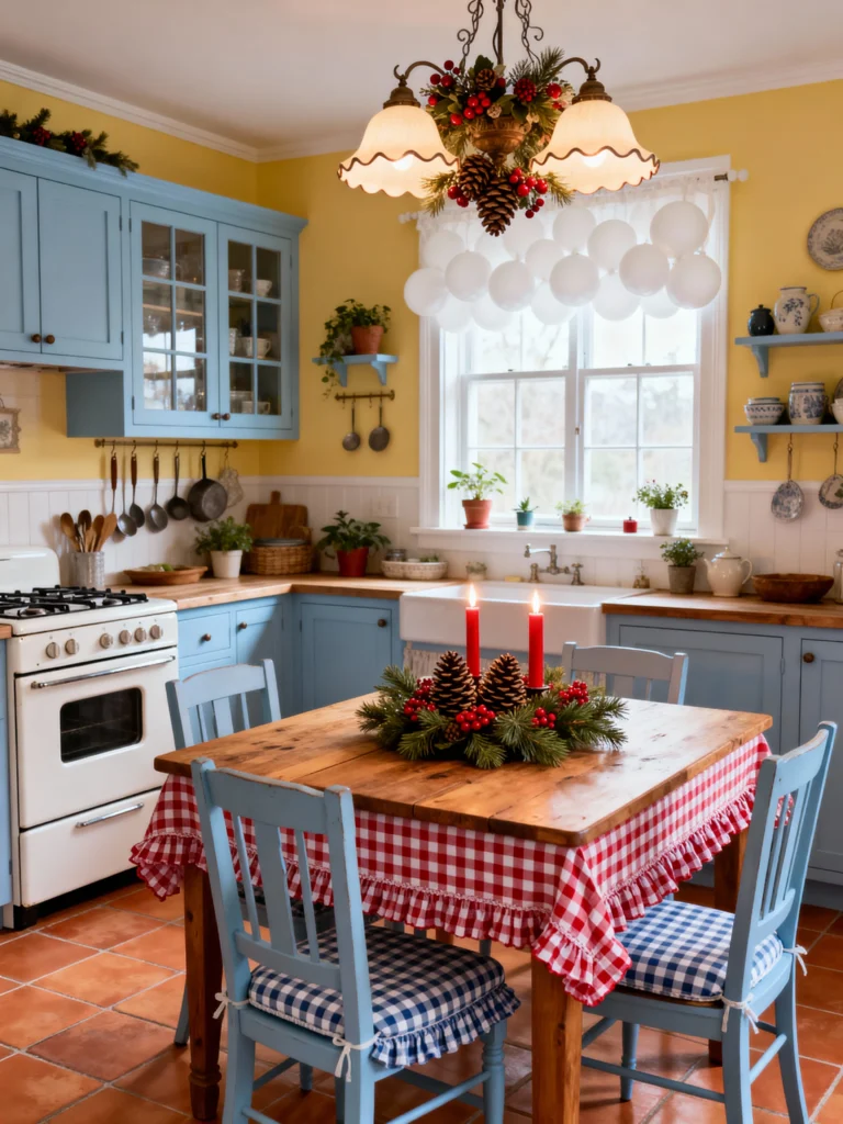 This kitchen is like a big, warm hug! The bold combination of buttery yellow walls and soft powder blue cabinets is unexpectedly delightful, creating a wonderfully bright and uplifting atmosphere. It’s decorated here for the holidays, and the wreath and candles on the wooden table make it feel incredibly festive and cozy. The red and white checkered tablecloth and the blue gingham chair cushions add that classic country charm. I especially love the tile flooring, which introduces a rich, earthy color that grounds the bright walls and cabinets. And notice the little details: the hanging pots and utensils show that this is a working kitchen, full of life and love!
