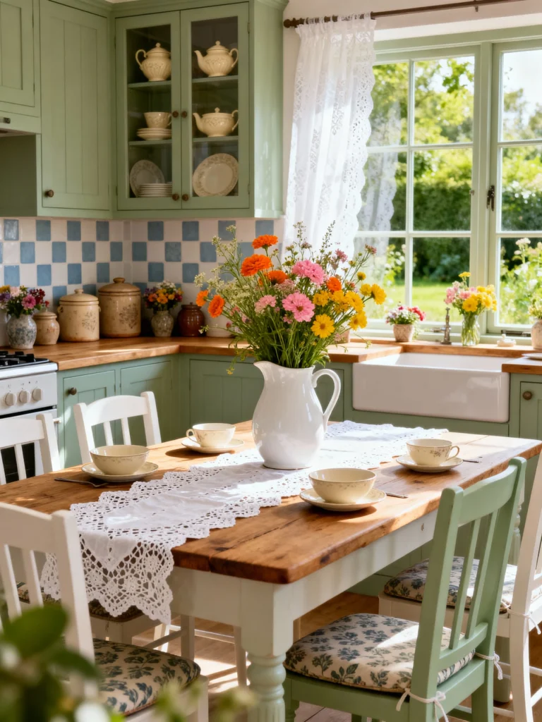 How refreshingly beautiful is this green kitchen? The soothing, soft mint color on the cabinets creates an immediate sense of calm and is perfectly complemented by the checkered blue and white backsplash. This isn’t just a space for cooking; it’s a lovely dining nook as well! The sturdy, natural wood table painted with a pale base and paired with white and soft green chairs feels incredibly welcoming. The sheer, lacy curtain lets in all that gorgeous natural light while still adding texture. And you have to appreciate the stunning floral arrangement in the center—the vibrant oranges and pinks are the perfect contrast against the cool green palette. It’s truly a beautiful, light-filled space for gathering with loved ones.