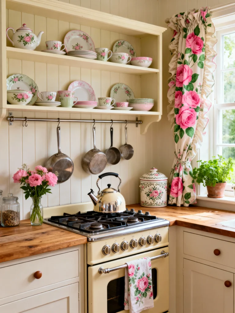 This kitchen is pure, romantic cottagecore elegance. The soft, creamy color palette of the cabinets and walls is the perfect backdrop for the magnificent pink rose curtain, which is truly the star of the show! The ruffle detailing on the curtain adds an extra layer of sweetness. The open shelving above the stove is beautifully styled with vintage floral china, transforming everyday dishes into works of art. The small, vintage-style stove and the brass kettle tucked onto the butcher block countertop reinforce that lovely old-world feel. Everything about this corner, from the simple vase of roses to the floral cookie jar, whispers of simple, beautiful living.