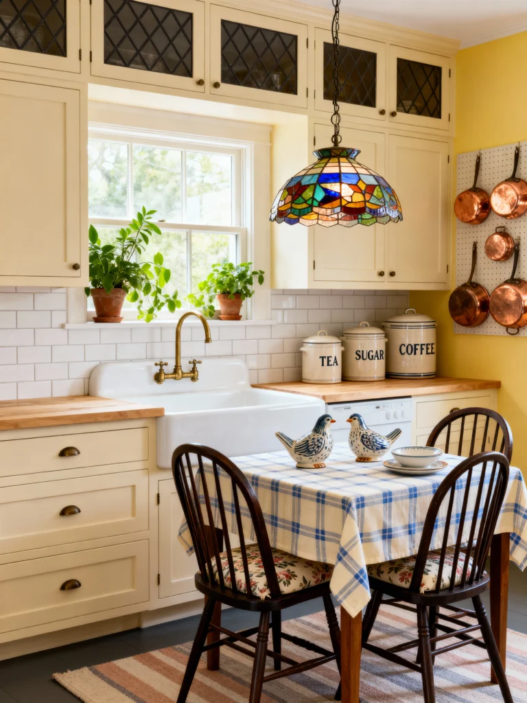 What a delightful, cheery space! The sunny yellow wall color and the creamy cabinets create an immediately warm and inviting atmosphere. The small dining area is incredibly charming, centered around a table set with a blue and white checkered tablecloth and those rustic, spindle-backed chairs. My favorite detail, hands down, is that stunning stained-glass light fixture—it casts a beautiful, warm glow over the entire space. The pair of ceramic ducks on the table and the vintage canisters on the counter add a fun, personalized touch. It feels like the kind of place where you’d linger over breakfast and a hot cup of coffee.