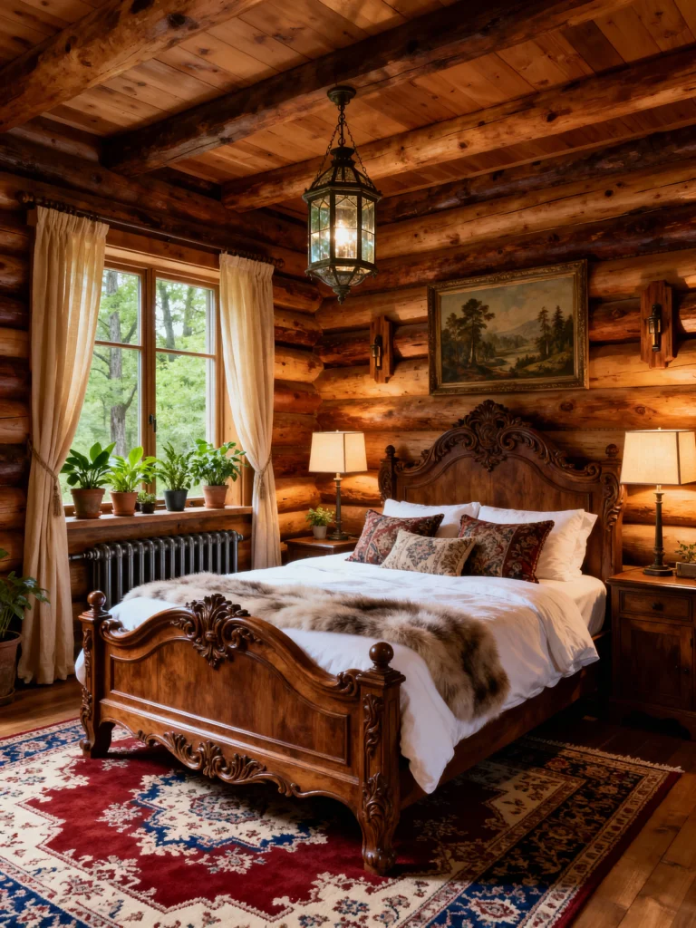 The first thing that catches my eye is that stunning, highly detailed wooden sleigh bed—it instantly brings a touch of classic elegance to the rustic, rough-hewn log walls. They’ve perfectly balanced the ruggedness of the space with sophisticated elements. Check out that beautiful lantern-style chandelier and the plush, patterned throw pillows! The white duvet keeps things feeling fresh, while the fur throw adds that essential touch of warmth and texture. And can we talk about the window plants? Such a simple way to bring life into the room, creating a lovely frame for the view. This room is all about making a rustic space feel utterly refined and comfortable.