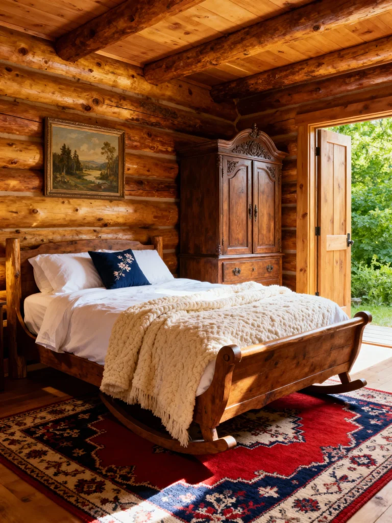 What a beautiful, bright space! Unlike some darker cabins, this one feels so open and airy, thanks to the natural light flooding in from that gorgeous, open door leading to the greenery. The log walls are lighter here, giving it a golden, sun-kissed feel. The sleigh bed is so beautifully crafted—it really anchors the room. I adore the chunky, cream-colored knit blanket draped over the foot; it adds a soft, inviting texture against the smooth white bedding. The antique dark wood armoire is a wonderful contrast and gives the room a historic charm. That bold, patterned rug ties the whole look together with a great pop of color. It’s rustic charm meets summer comfort!