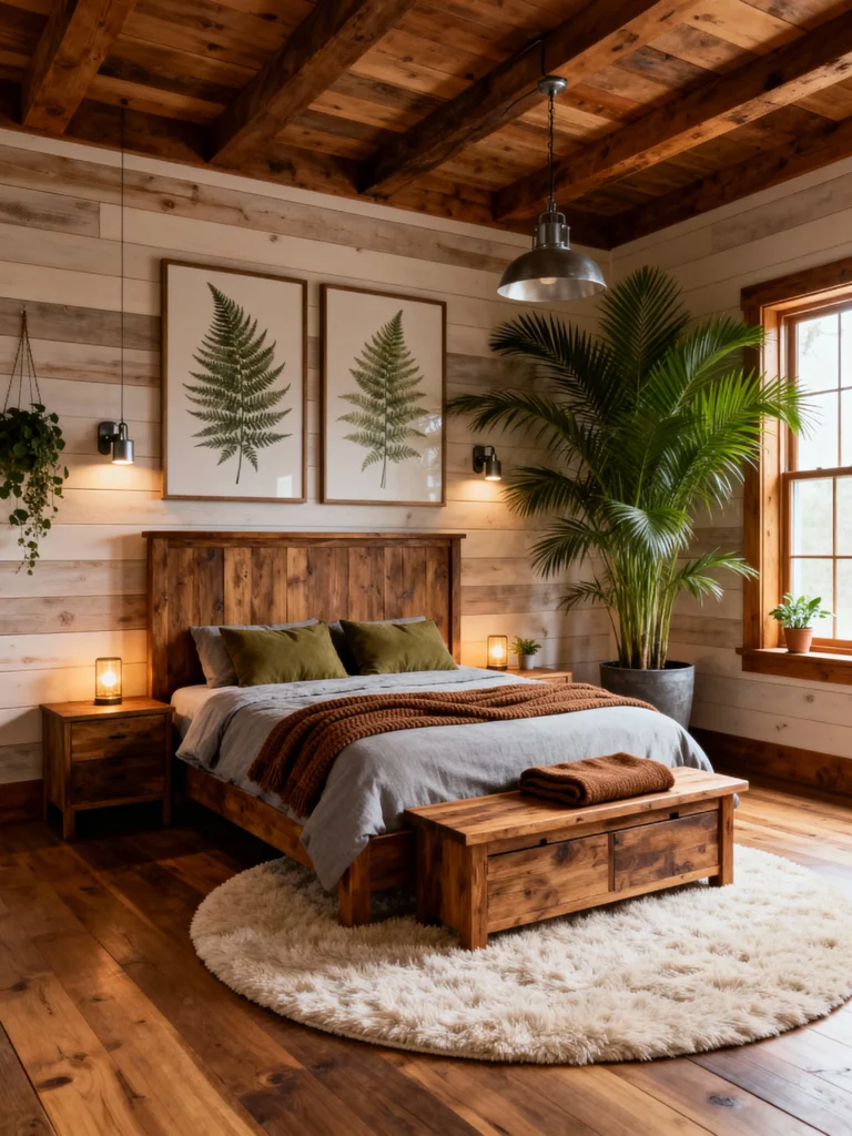 Okay, this one is for those who love the rustic look but want a cleaner, more modern finish! The walls here are shiplap, painted and paneled, rather than raw logs, giving it a fresh, updated feel. The rich, dark wood furniture and ceiling beams still provide that cabin warmth. Green is the star here—from the olive bedding to the massive palm plant in the corner, and those gorgeous framed fern prints above the bed. It truly brings the outside in! The simple, industrial light fixture and the round, fuzzy rug complete the look, making it feel organic and stylish. It’s rustic, but make it chic.