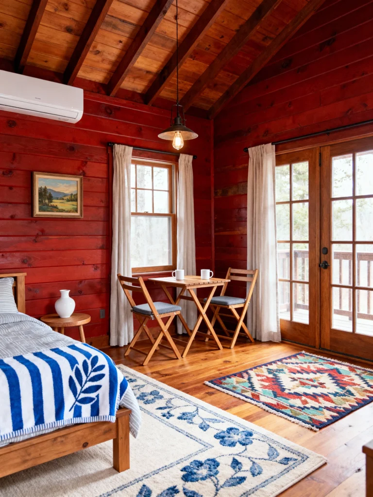 The striking red-stained wood walls make this space unforgettable. It’s a bold choice that truly captures that camp or rustic cabin spirit. To balance the intense wall color, they’ve used crisp white curtains and a light-colored rug with blue floral accents. I love the playful contrast of the blue-and-white striped blanket on the bed. That little folding wooden table with two simple chairs is the perfect spot for morning coffee, right by the french doors leading outside. It’s a fun, vibrant take on cabin decor that feels less like a winter den and more like a summer retreat.