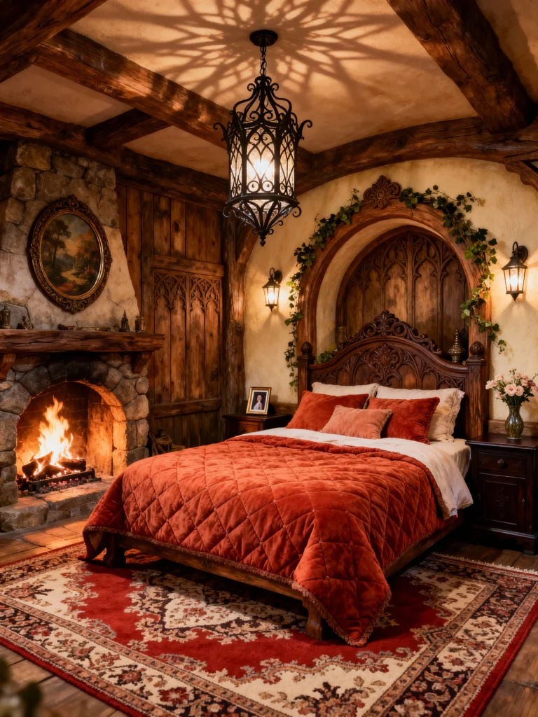 This room is pure fantasy and romance. The stunning carved wood headboard is the centerpiece, set inside a beautiful arched alcove draped with greenery. The massive stone fireplace with a roaring fire adds incredible warmth and drama. Everything about this room is rich and textural: the deep orange-red velvet quilt, the dark wood beams, and the intricate Persian rug. The lighting—a gorgeous gothic chandelier and ambient wall sconces—creates beautiful shadows and a super moody atmosphere. This isn’t just a bedroom; it’s a breathtaking, storybook sanctuary.