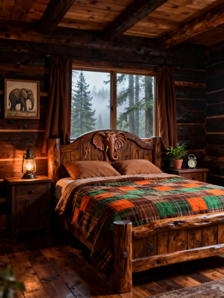 Now this is a seriously cozy, dark, and moody cabin!The walls and ceiling are stained a deep, rich brown, which gives the room an immediate sense of intimacy and warmth, especially contrasted with the foggy view outside. The standout piece is that headboard with the carved elephant detail—it’s so unique and adds a playful, adventurous touch! The plaid blanket, with its earthy greens, oranges, and browns, perfectly complements the dark wood. The warm glow from the antique lantern on the nightstand seals the deal, giving the room a classic, rugged explorer feel. It’s the perfect place to hunker down and listen to the rain.