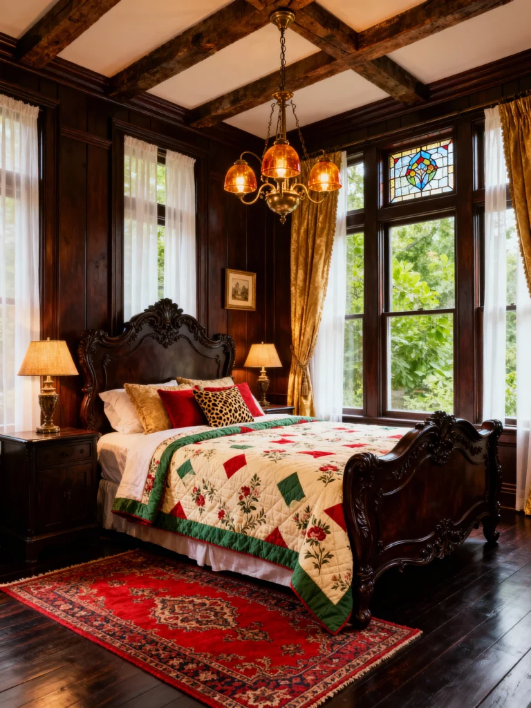 This room feels like a luxurious, historic manor house tucked away in the woods! It definitely leans more toward a sophisticated, Victorian style with the dark wood paneling and the ornate, carved bed frame. I absolutely love that stained-glass window in the corner—it adds such a unique pop of color and architectural interest. The bedding choice is fantastic: a traditional, folksy patchwork quilt that brings a handmade, cozy contrast to the formal dark wood. The rich gold curtains and red area rug complete the look, making the room feel incredibly decadent and warm, almost like stepping back in time.