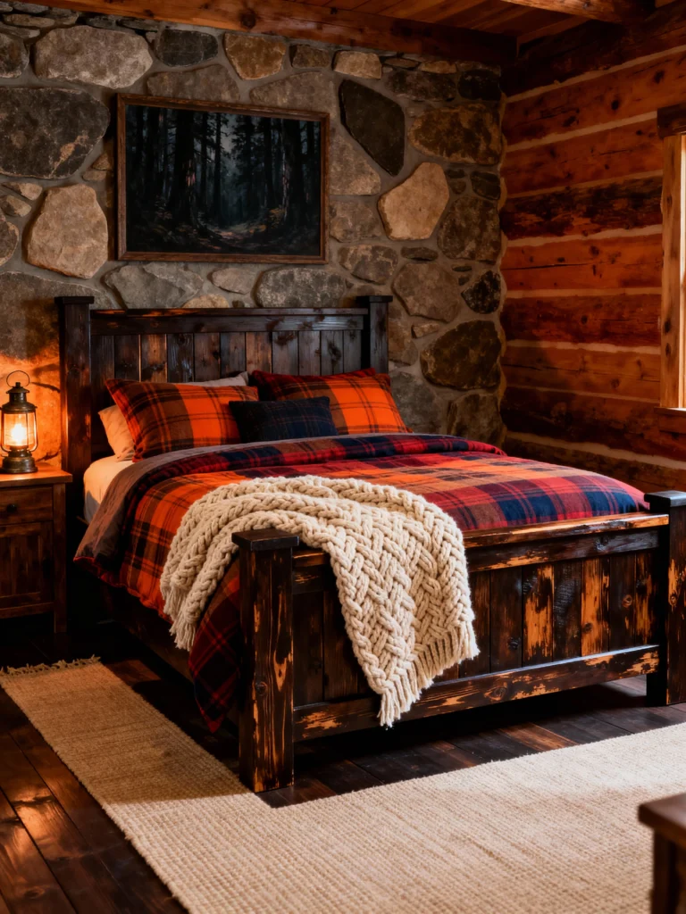 This bedroom has a perfect blend of texture and color. The combination of the dark log walls and the rough-hewn stone wall behind the bed is rustic perfection. The dark, substantial wood of the bed frame grounds the room. My favorite detail? That classic red, orange, and navy plaid duvet—it’s the perfect color palette for a fall or winter retreat. Paired with that thick, cable-knit cream throw, it looks incredibly inviting. The simple, light jute rug and the oil lantern on the nightstand complete this look. It’s simple, rugged, and exactly what you picture when you think of a cozy cabin.