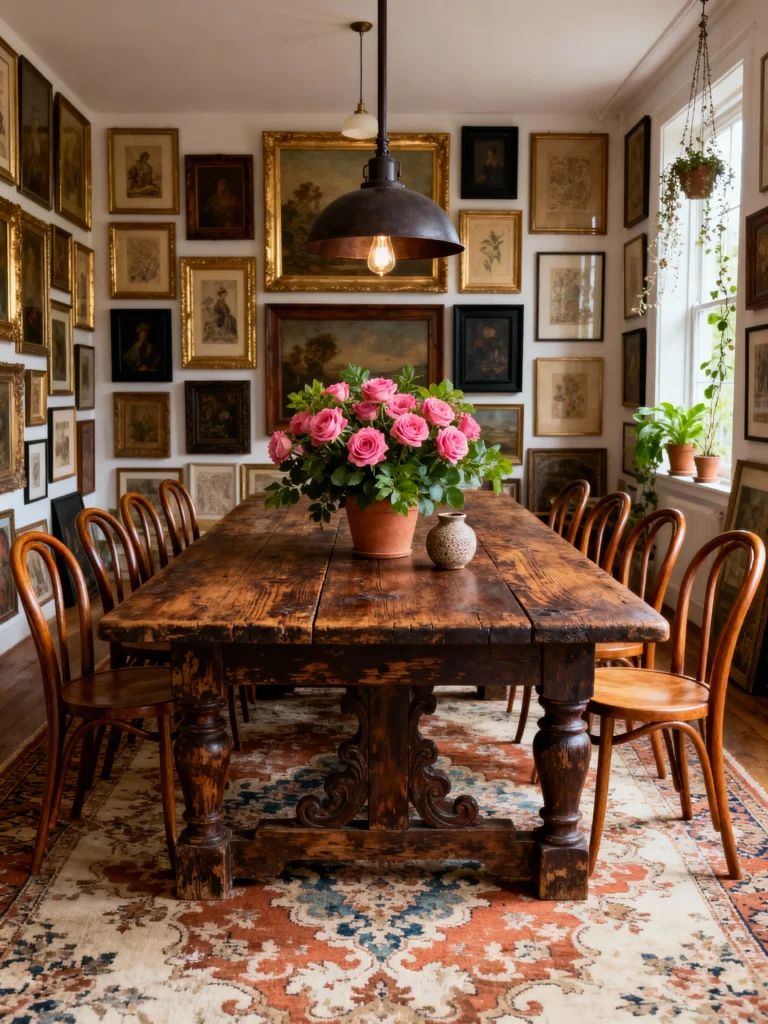 Finally, we have this stunning rustic dining room. This is “Grandmillennial” style at its best. The wall is absolutely covered in vintage-style sketches and gold frames, which creates a cozy, historical feel. The heavy, weathered wooden table looks like it has a thousand stories to tell. It’s a perfect example of how “clutter” can actually feel organized and intentional when you stick to a consistent color palette of wood, gold, and cream.