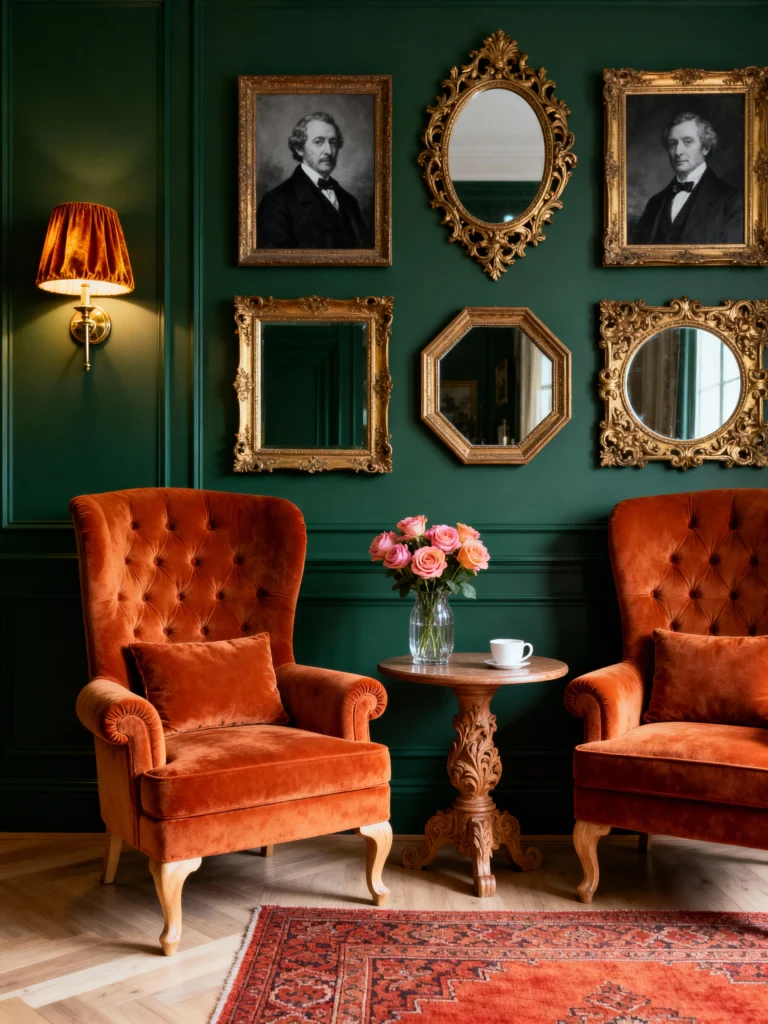 Green and gold is a classic combo for a reason—it just feels expensive! This gallery wall is a masterclass in balance. By mixing traditional portraits with empty, ornate gold mirrors, the space feels curated rather than cluttered. Those twin burnt-orange chairs are shouting “sit down and stay a while.” If you want to replicate this, don’t worry about matching your frames perfectly; the variety is what gives it that lived-in, soulful character.