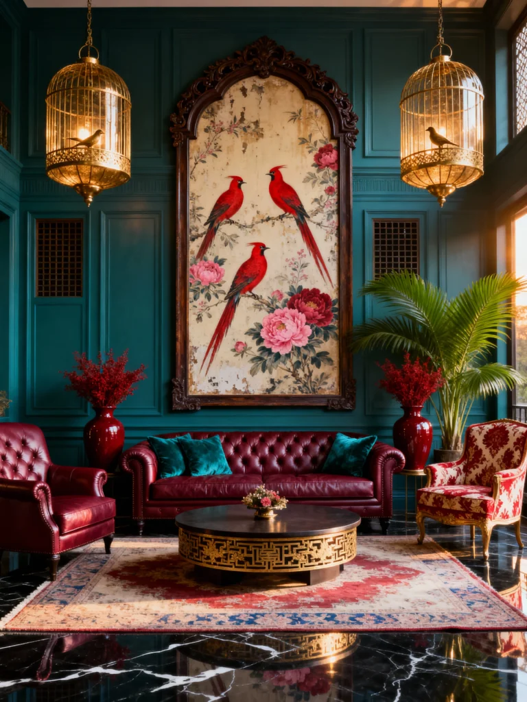 This room feels like a modern palace. We’re moving into some seriously rich territory here with the deep burgundy leather sofa and matching chairs. What really catches my eye, though, is the Chinoiserie-style bird art. It’s huge! Using one massive, vertical piece of art is a brilliant trick to make your ceilings look ten feet taller. The gold birdcage chandeliers add that final touch of “wow” factor that makes the room feel truly unique.