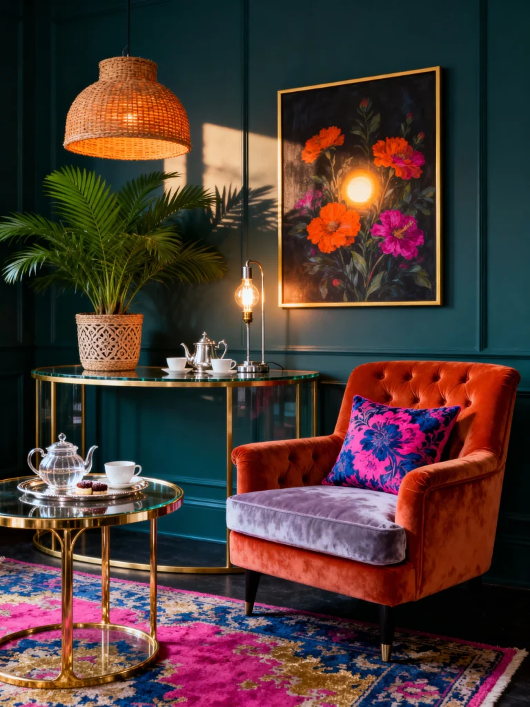Sometimes you don’t need a whole room to make a statement—just a perfect corner. This teal-paneled wall is the ideal backdrop for a little tea station. The mixture of textures here is what makes it feel cozy: the woven wicker lampshade, the smooth glass table, and the plush purple-and-orange velvet chair. It’s proof that you can mix bold floral patterns with solid jewel tones and still have it look incredibly chic.