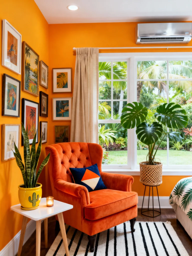 Okay, let’s brighten things up! This room is like a shot of Vitamin C. If you’re a fan of “Dopamine Decor,” this bright orange wall is your spirit animal. It’s loud, it’s proud, and it looks amazing against the tropical greenery outside the window. By keeping the rug a simple black-and-white stripe and the curtains neutral, the orange is allowed to be the star without being overwhelming. It’s a happy, sunshine-filled space.