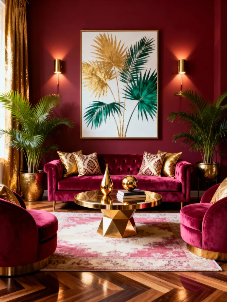 This is pure, unadulterated glamour. The monochromatic look—where the sofa and the walls are almost the same shade of deep magenta—is a high-end designer move. It creates a seamless, immersive feeling. To stop it from feeling too heavy, they’ve added loads of gold accents: the coffee table, the lamps, even the throw pillows. It’s the kind of room where you’d want to sip a cocktail and listen to some jazz.