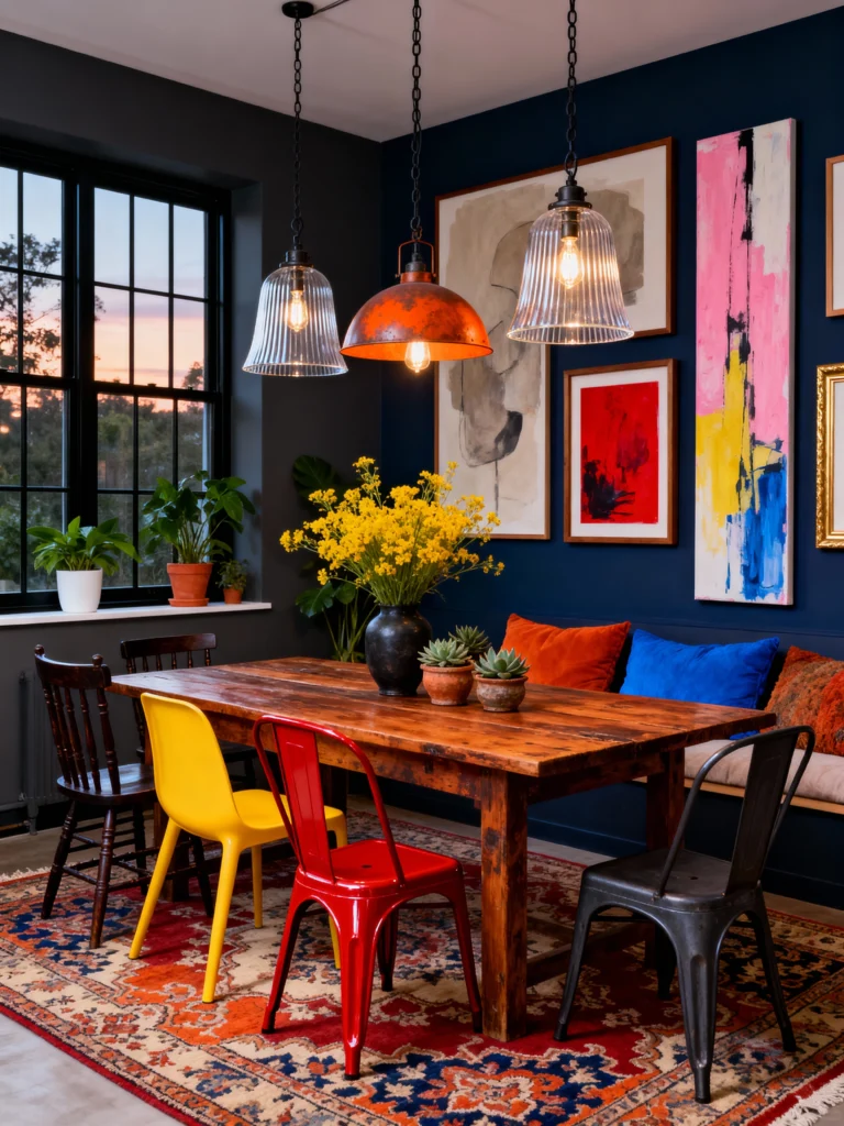 Who says dining rooms have to be formal? This space feels like a cool downtown bistro. The dark charcoal walls make the mismatched, colorful chairs (red, yellow, black) really stand out. It’s a great way to use furniture you might already have! The long wooden table and the oversized industrial pendant lights give it a rugged, “collected” feel. It’s the perfect spot for long Sunday brunches with friends.