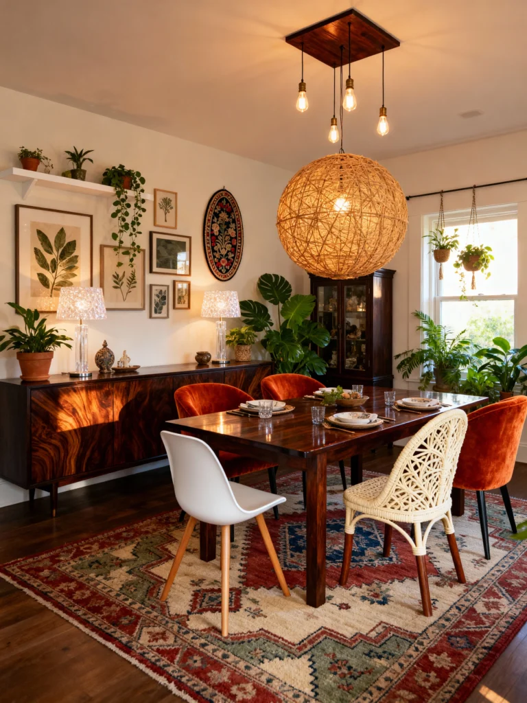 This dining area is a beautiful blend of Mid-Century Modern and Boho. That massive twine-ball pendant light is a total conversation starter! I love how they’ve used a long, dark wood sideboard to display plants and art. It keeps the “maximalist” vibe going without cluttering the actual dining table. The mix of orange velvet chairs and one white molded chair keeps the look playful and prevents it from feeling too “stiff.”