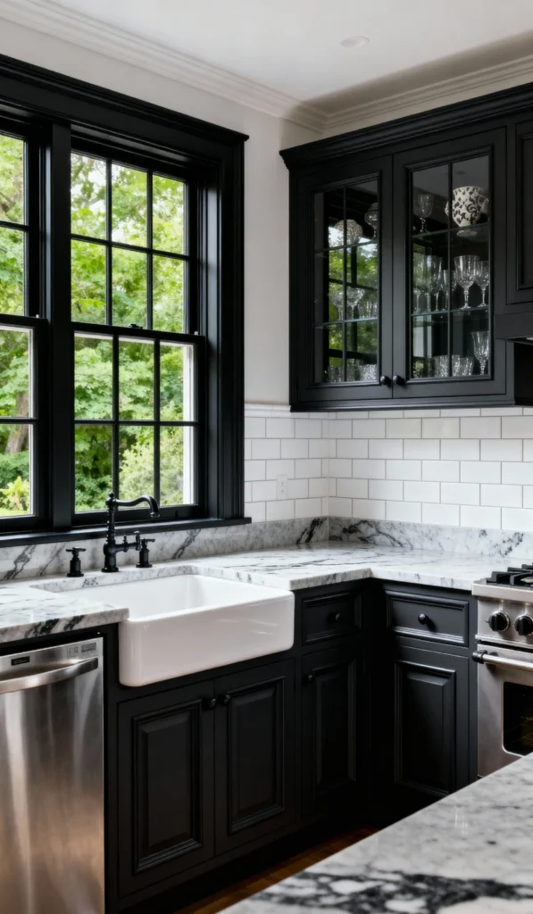 This space proves you can rock a dark color palette while keeping a traditional, charming feel. The black cabinets are framed by crisp white subway tile and a subtle marble countertop. The beautiful black window frames create a dramatic picture of the greenery outside, anchoring the corner perfectly. I love the classic white farmhouse sink and the glass-front upper cabinet showing off the dishes. It’s a look that feels both historic and fresh, perfect for a cozy but stylish home.