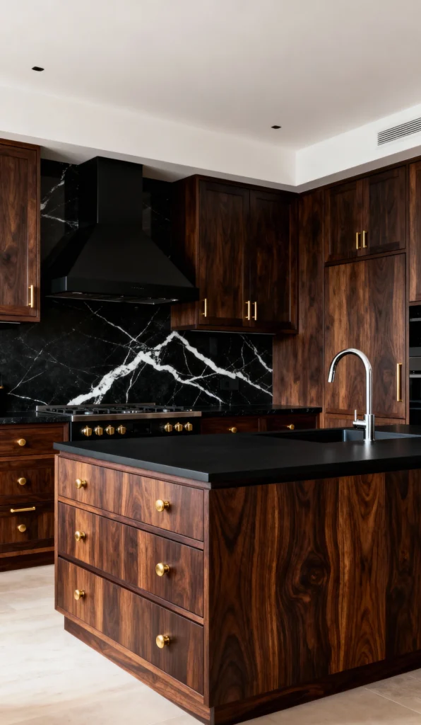 Can we just take a moment for this incredible wood grain? The rich, dark walnut cabinets are an absolute showstopper. Paired with the dramatic black marble backsplash—complete with striking white veining—this kitchen exudes pure luxury. The brass hardware is the perfect jewelry for the wood, offering a warm contrast to the cool, dark stone. It’s a masterclass in textures, proving that a dark kitchen can feel incredibly warm and inviting. What a sophisticated space to cook in!