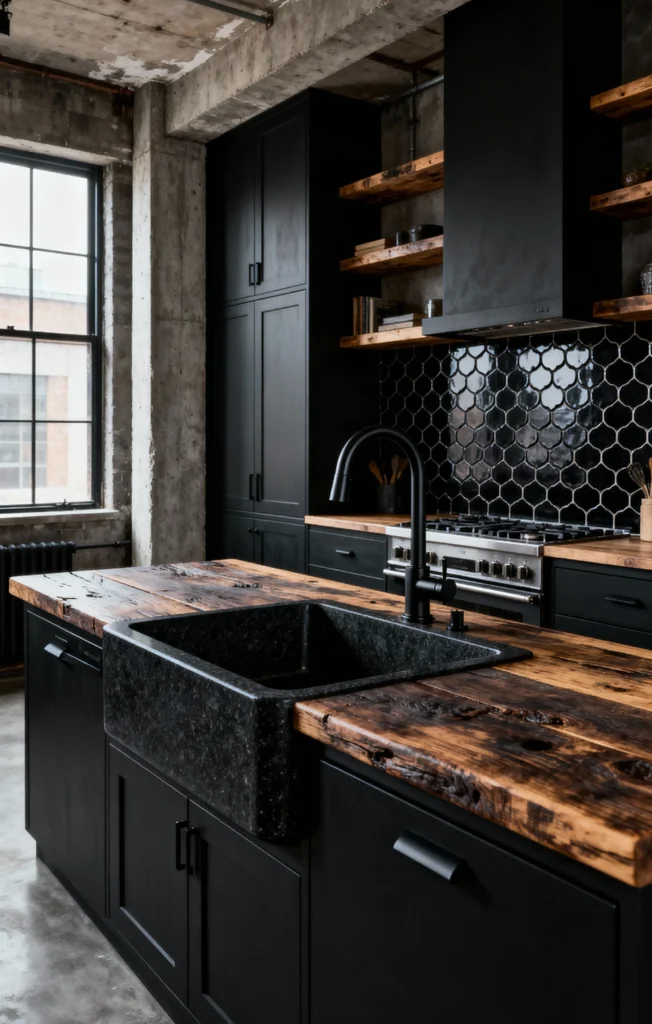 If you love an industrial loft vibe, this one’s for you. The raw concrete pillar and ceiling beams are a fantastic backdrop for the matte black cabinets and hood. The use of reclaimed or heavily distressed wood for the countertops and the open shelves brings an organic, earthy feel. Check out that farmhouse sink made of dark, speckled stone—it’s rugged and chic all at once. The black hexagonal tile backsplash adds a lovely, understated texture. This kitchen is a perfect blend of hard industrial materials and warm, natural wood.