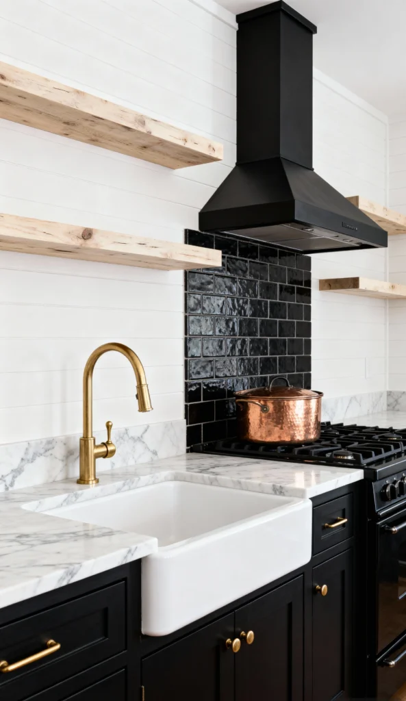 Here’s a perfect blend of rustic and refined! The bottom black cabinets with gold hardware are grounding and chic. Above that, the shiplap walls and simple, unfinished wood floating shelves add that essential farmhouse charm and lightness. The white marble countertop and oversized farmhouse sink keep things classic and bright. The touch of black subway tile behind the range hood ties the dark elements together beautifully. And how lovely is that brass faucet? It’s a bright, welcoming, and perfectly balanced space.