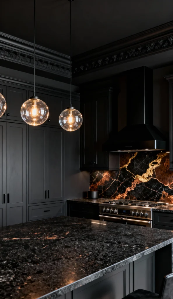 Stepping into this kitchen feels like entering a luxurious lair! The matte, deep charcoal cabinets and walls create a dramatically enveloping, monochrome feel. But the magic happens at the backsplash: a stunning black marble with veins that look like molten gold and copper. This fiery accent immediately warms up the space and provides a spectacular focal point behind the stove. Simple, clear globe pendants provide the perfect ambient light. It’s an incredibly rich and sophisticated design choice.