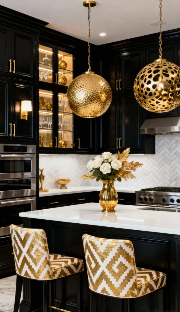 Prepare to be dazzled! This kitchen goes all-in on black and gold for a look of sheer opulence. The ornate, traditional black cabinetry sets a sophisticated foundation, while the lighting fixtures—those giant, perforated golden globes—steal the show. The white marble island and backsplash are a clean canvas, letting the gold accents (including the fun patterned bar stools and cabinet hardware) truly pop. This is how you entertain in style; it’s bold, glamorous, and unforgettable.
