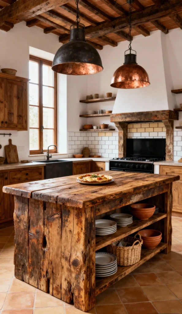 This kitchen takes the rustic look to a whole new level! That massive, distressed wood island is the ultimate centerpiece—it looks like it has a rich history. The exposed wood ceiling beams and chunky wood hood vent really lean into the classic, almost Tuscan farmhouse aesthetic. The large, hammered copper pendant lights add warmth and a touch of antique flair, reflecting the rustic tones of the wood and the terracotta-tiled floor. It’s wonderfully heavy on character and texture.