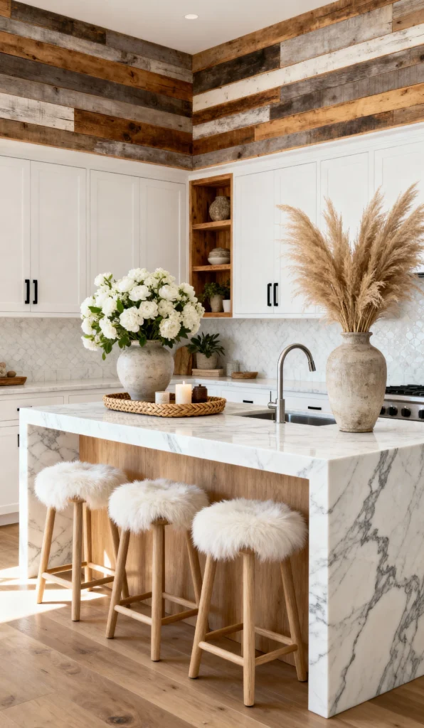 This is how you do luxurious texture! The massive marble island is certainly a showstopper, but notice how they softened all that stone. The paneling of reclaimed wood running up the wall adds incredible warmth and visual interest, perfectly connecting the white cabinets to the wooden floor. And seriously, those furry white bar stools? They look unbelievably comfy and add a touch of glamour and fun. It’s a chic, cozy, and expertly balanced space.