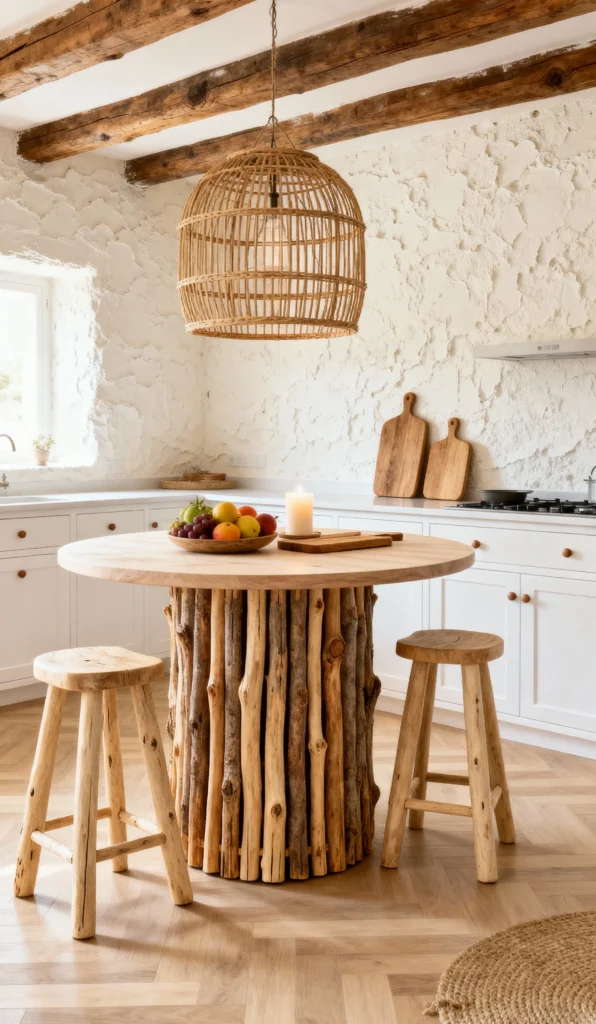 Talk about a conversation starter! If you want your kitchen to feel like a charming countryside escape, take notes. The rough, white-washed, textured wall and exposed ceiling beams set a gorgeous backdrop. But the star? It’s absolutely that island, made from vertical logs and topped with a smooth, light wood surface. Paired with the simple wooden stools and the massive rattan pendant light, this whole space is dripping in organic, rustic goodness. Such a clever, natural way to anchor the room!
