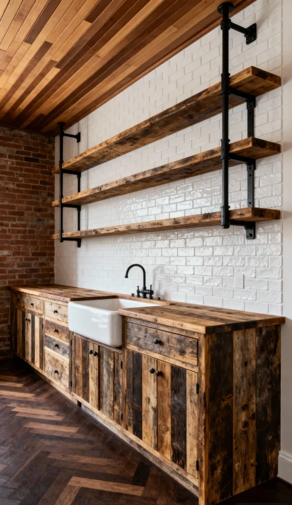 This space has amazing industrial-meets-farmhouse vibes. The subway tile backsplash and exposed brick wall provide a classic, textured foundation. The cabinet base is made from beautifully reclaimed, dark-stained wood, giving it a rich, storied feel—a great way to add depth! I’m also loving the open shelving supported by those chunky black industrial pipes. It’s a stylish and practical way to show off your favorite dishes and keep the look light and airy above the gorgeous farmhouse sink.