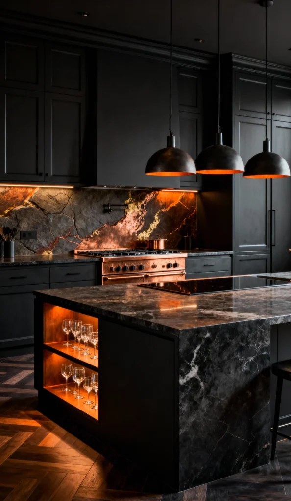 This kitchen embraces a moody, luxurious feel with its matte black cabinets and island. The show-stopper is undoubtedly the backsplash and the range hood: a dark, highly-veined stone with dazzling copper and gold accents. And look at that range—it’s a matching copper beauty! The recessed lighting under the island shelf adds an incredible orange glow, making the whole room feel like a warm, exclusive speakeasy. This is a bold, sophisticated design for anyone who loves high contrast.
